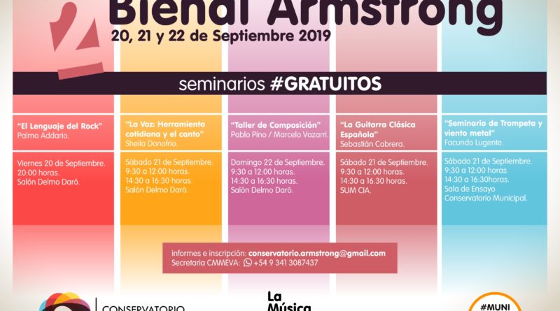La Municipalidad de Armstrong a través del Conservatorio Municipal de Música “Enzo Vacchino” presenta la 2° Bienal de Música que se ofrecerá los días 20, 21 y 22 de septiembre de 2019 con una importante grilla de seminarios gratuitos, dictados por prestigiosos músicos.