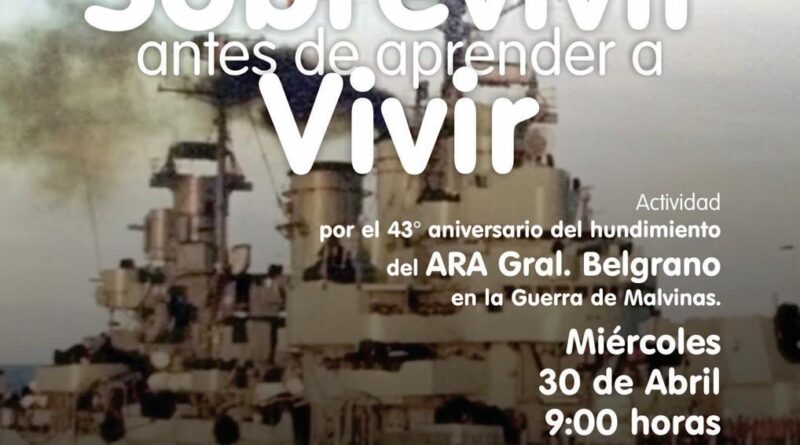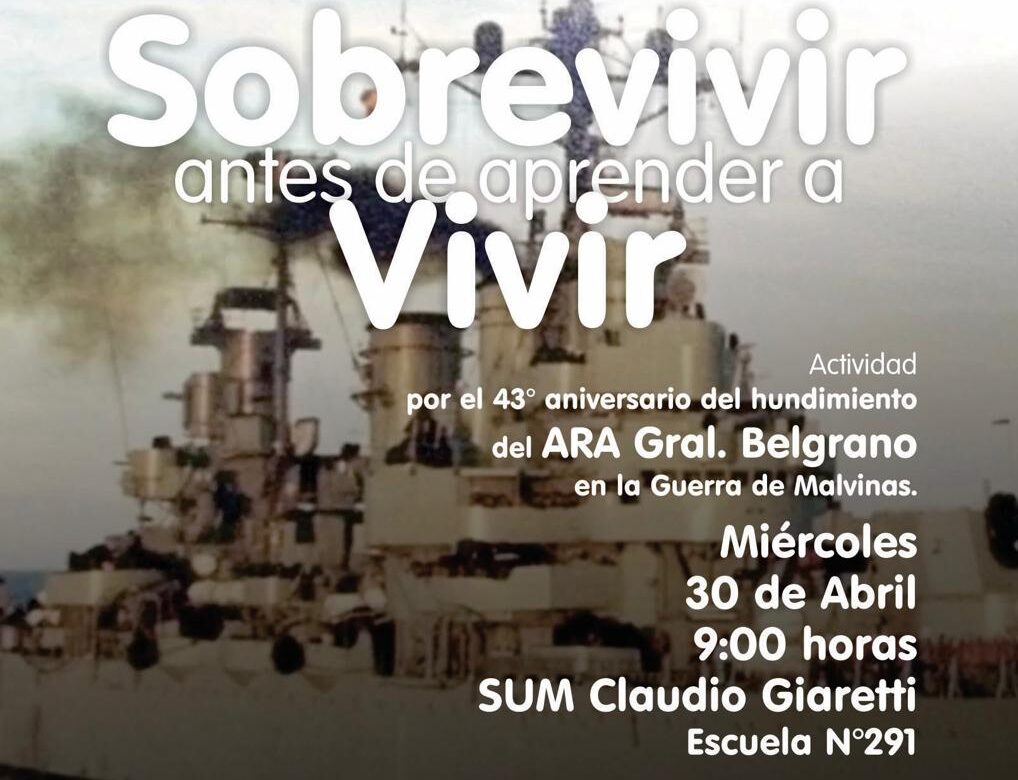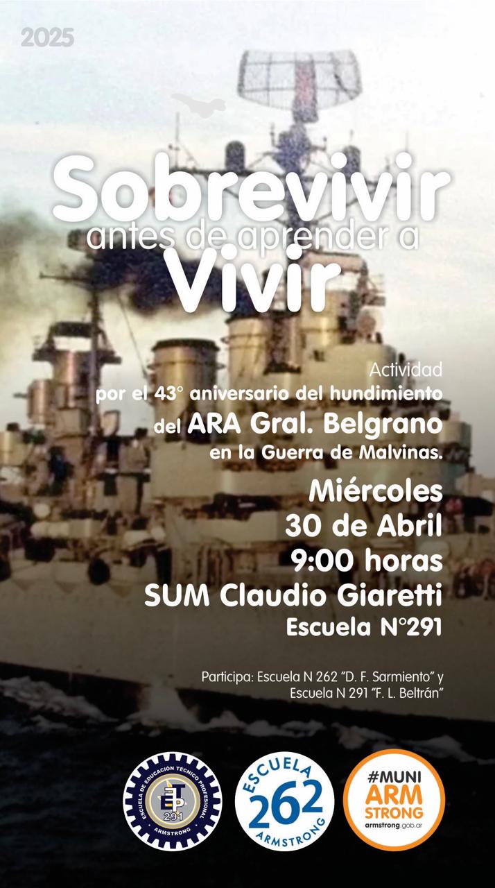 En conmemoración al aniversario 43 del hundimiento del ARA Gral Belgrano en la guerra de Malvinas, Municipalidad de Armstrong junto a las Escuelas N° 262 “Domingo F. Sarmiento” y N° 291 “Tte. Cnel. Fray Luis Beltrán”, realizarán una actividad especial el miércoles 30 de abril, 9 hs. en el sum de la Escuela Técnica que lleva el nombre “Claudio Giaretti”.