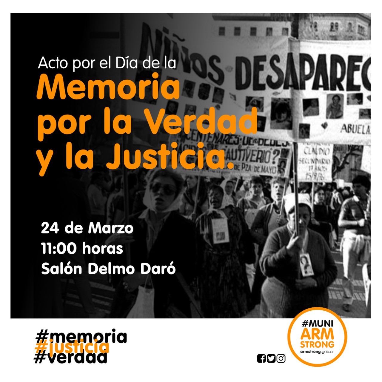 La Municipalidad de Armstrong invita a toda la ciudadanía a participar del acto en el Día Nacional de la Memoria por la Verdad y la Justicia que se realizará el día viernes 24 de marzo a las 11 hs. en el salón auditorio Delmo Daró.
