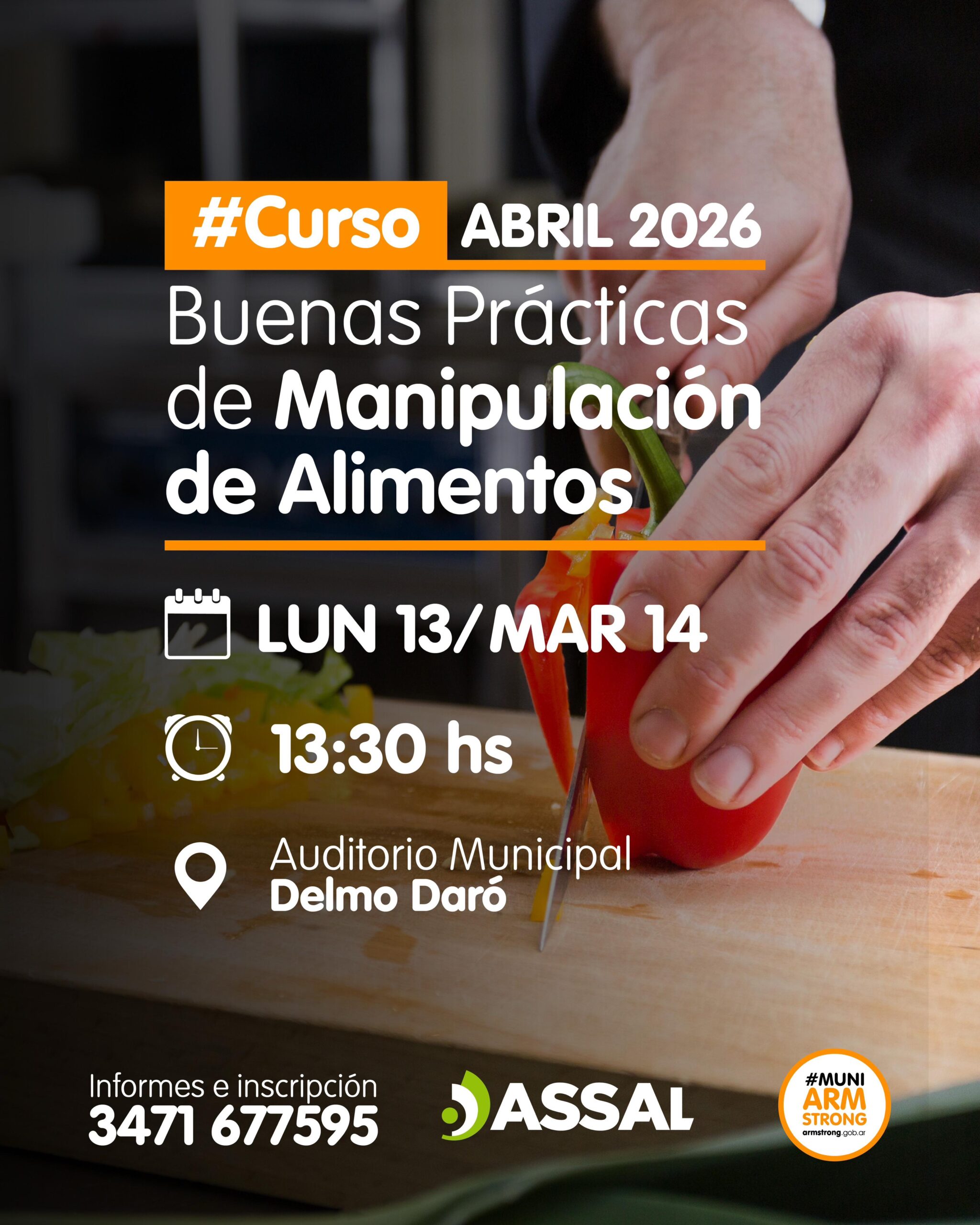 LocalesNoticias Armstrong: Curso de Bromatología 7 abril, 2026 jorge radio Lunes 13 y martes 14 de abril 13.30 horas en el Auditorio Municipal Delmo Daro Primer curso del año sobre buenas prácticas de manipulación de alimentos dirigido a quienes elaboran, venden y o distribuyen alimentos para el consumo humano. http://fmsolarmstrong.com/wp-content/uploads/2026/04/Curso-manipulacion-de-alimentos-F-14-de-Abril-2026.mp3 CompartirTwittear0 Compartir