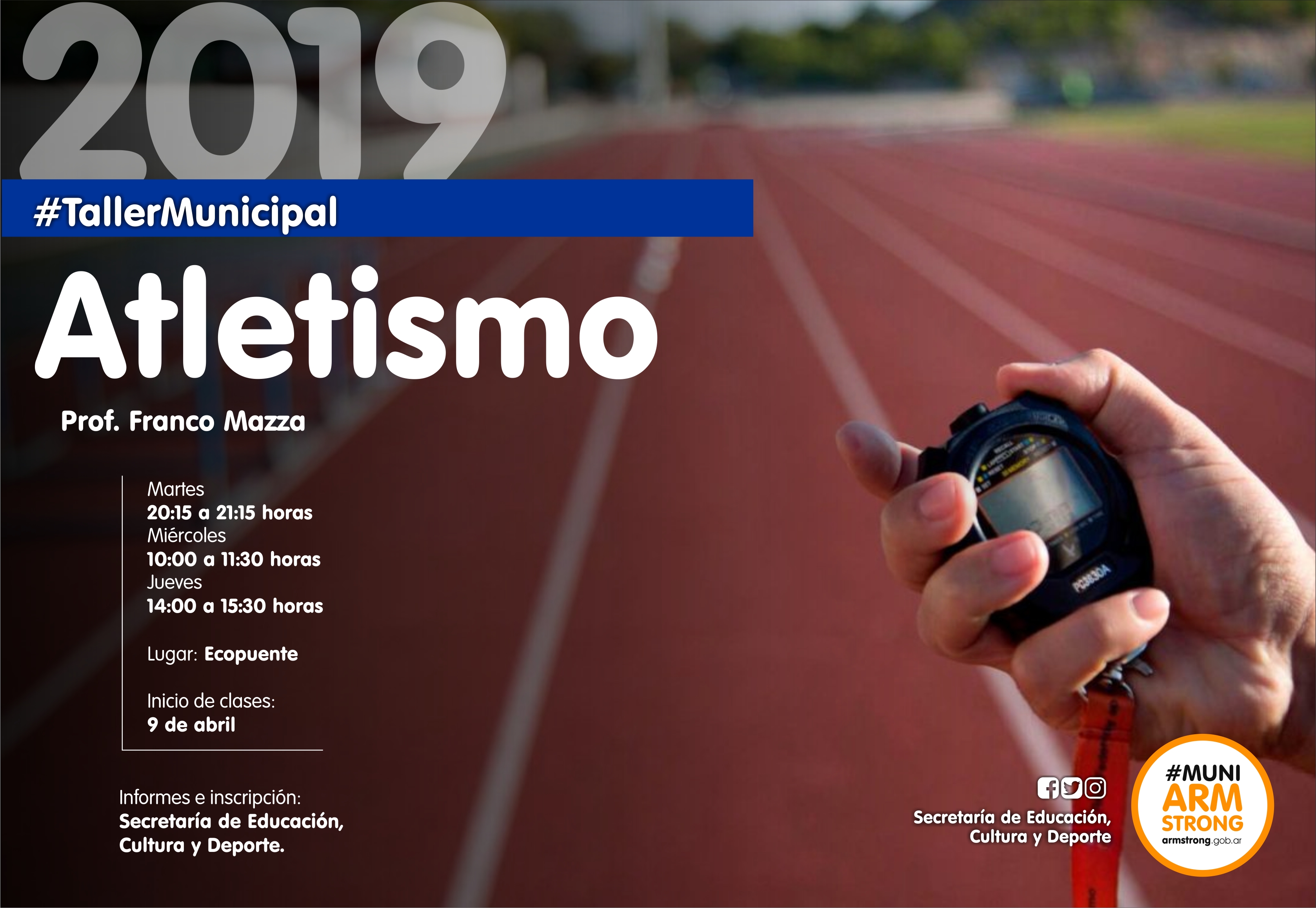 LA MUNICIPALIDAD DE ARMSTRONG TE INVITA A SER PARTE DE LA ESCUELA DE ATLETISMO, DISTINTAS DISCIPLINAS, PARA TODAS LAS EDADES, A CARGO DEL PROFESOR FRANCO MAZZA. CLASES EN EL ECOPUENTE LOS DÍAS MARTES DE 20:15 A 21:15 HS., Y MIÉRCOLES DE 10 A 11:30 Y JUEVES DE 14 A 15:30 HS. ACERCATE, HACÉ ACTIVIDAD FÍSICA. TE ESPERAMOS! ESCUELA MUNICIPAL DE ATLETISMO. INICIA: 9 DE ABRIL»