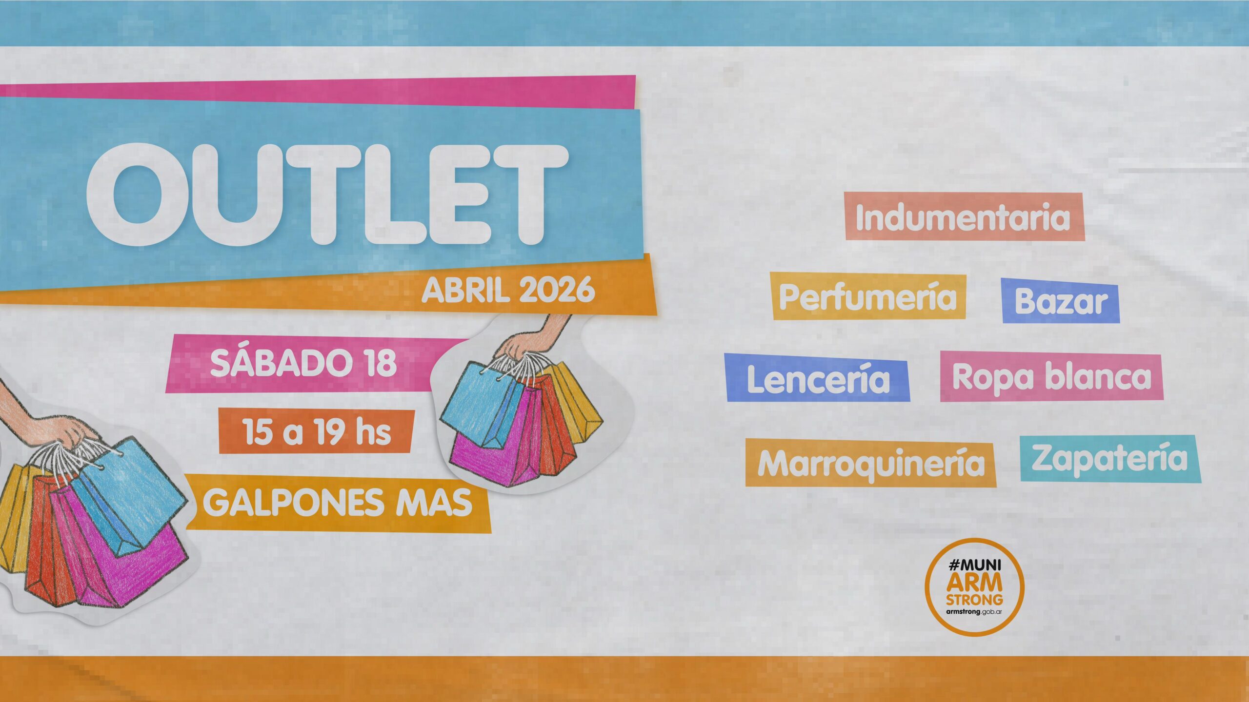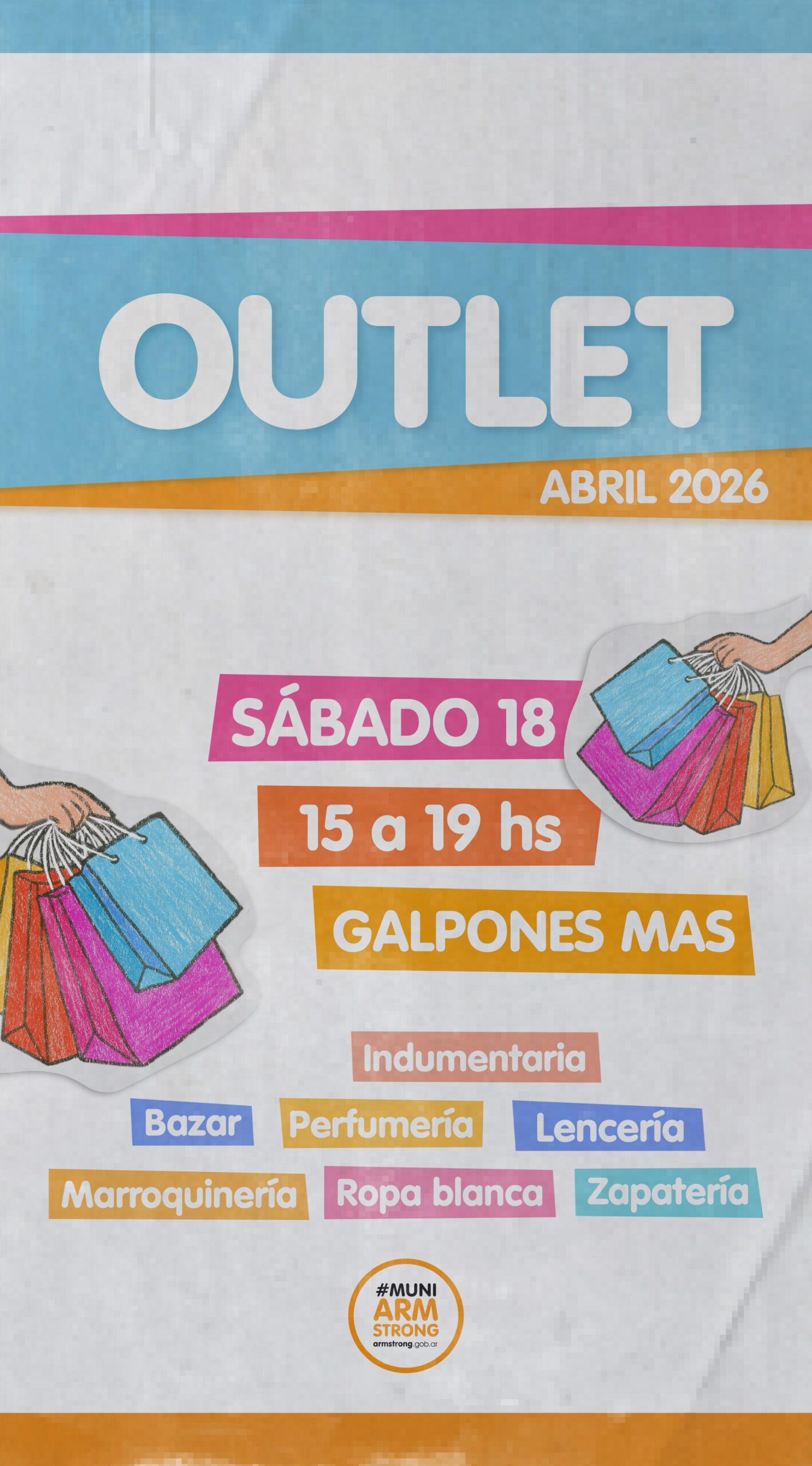 EventosLocalesNoticias Armstrong: Gran Outlet 7 abril, 2026 jorge radio Gran Outlet en Galpones Más, sábado 18 de abril desde las 15 horas Comercios locales que ofrecerán importantes descuentos en indumentaria, bazar, perfumería, lencería, marroquinería, ropa blanca y zapatería para toda la familia. http://fmsolarmstrong.com/wp-content/uploads/2026/04/Outlet-F-18-de-Abril-2026.mp3 CompartirTwittear0 Compartir