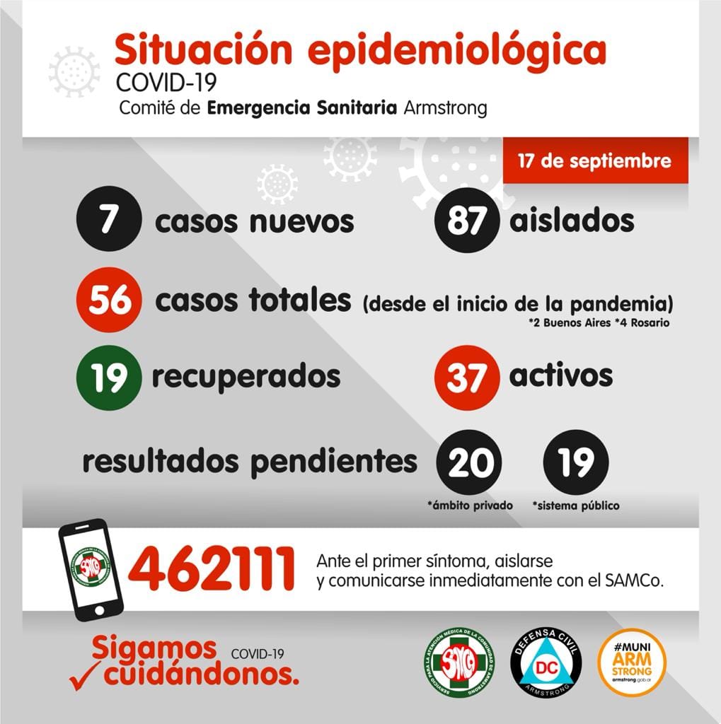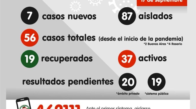 Informamos 7 nuevos casos positivos en nuestra ciudad, y 3 altas. Hisopados pendientes 20 del ámbito privado y 19 del sistema público. Ante la aparición de síntomas recomendamos autoaislarse y consultar a su médico, o llamar al SAMCO 462111.