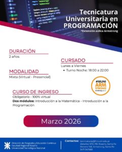 La Universidad Tecnológica Nacional junto a la Municipalidad de Armstrong informan que están abiertas las inscripciones para las carreras que se dictarán durante ciclo 2026, en la Extensión Áulica ubicada en calle Moreno 146 de la ciudad, con cupos limitados.