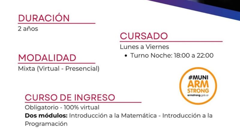 Días de dictado: Lunes a Viernes de 18:00 a 22:00 hs. Modalidad mixta (virtual-presencial). Duración: 2 años y medio. Curso de ingreso: Obligatorio: 100% virtual. Informes e inscripción: www.utnarmstrong@gmail.com, Whatsapp 3471-347685. Las tecnicaturas son carreras cortas que permiten una rápida salida laboral que dé respuestas a las necesidades del medio.