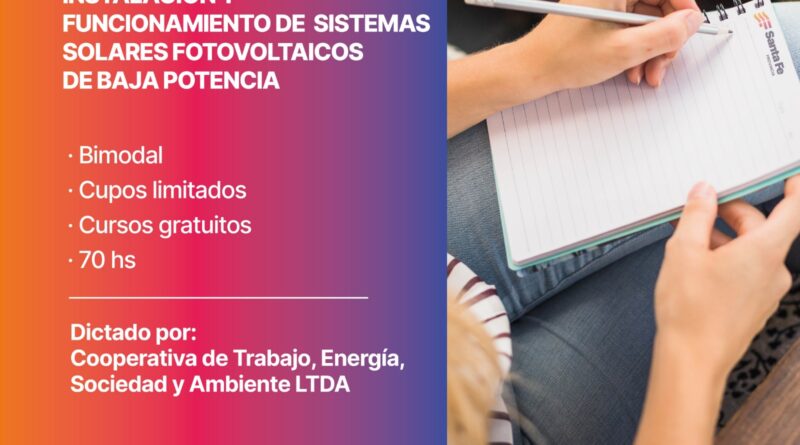 La misma tiene una carga horaria de 70 hs. reloj y es dictada por la Cooperativa de Trabajo, Energía, Sociedad y Ambiente Ltda. de la localidad de Arroyo Seco, con modalidad bimodal. Requisitos de ingresos: Mayores de 16 años, técnicos y electricistas con interés en ampliar la oferta de servicios relacionados al dimensionamiento e instalación de sistemas solares fotovoltaicos de baja potencia. Emprendedores vinculados a los servicios de dimensionamiento e instalación de energía solar fotovoltaica. Personas desocupadas.