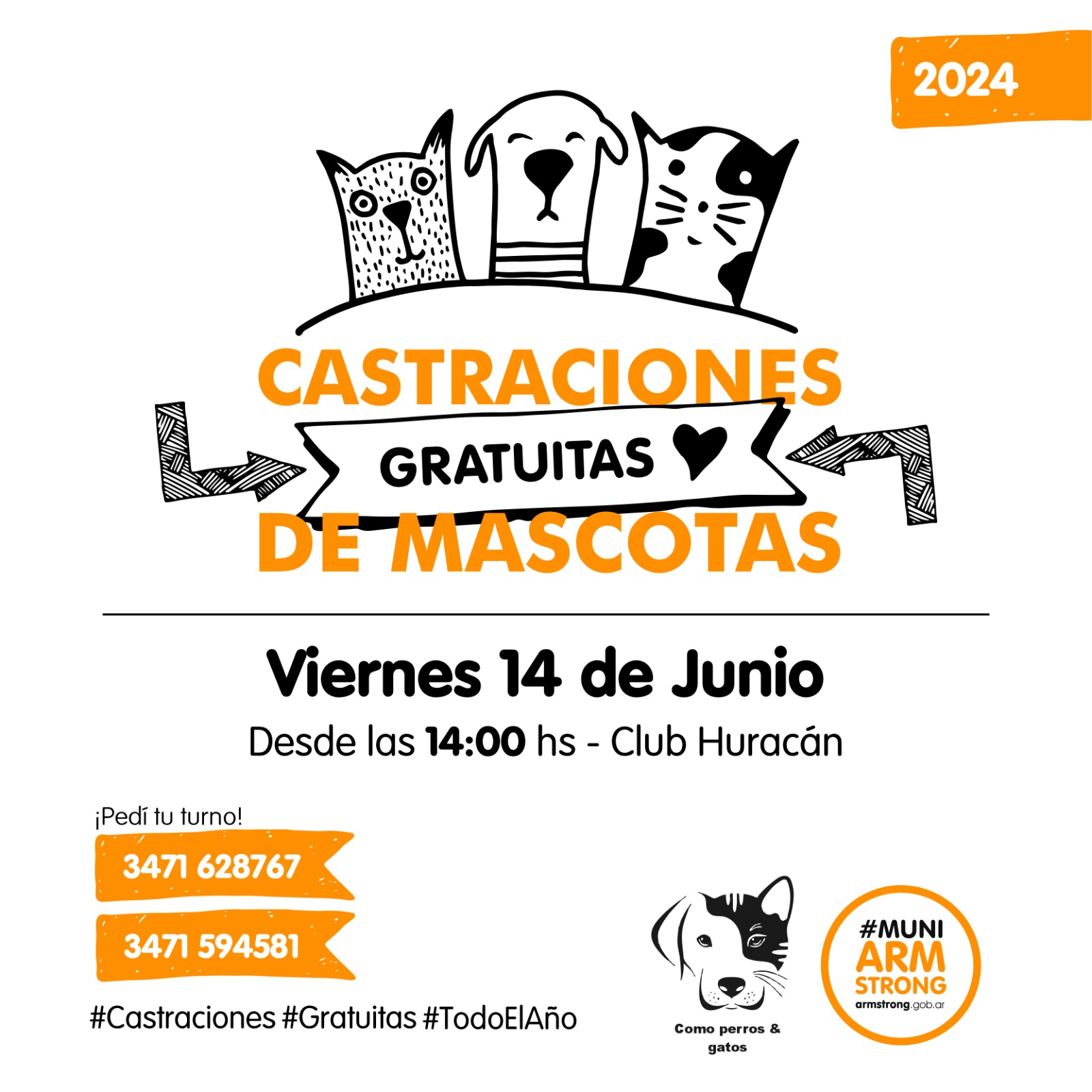 La Municipalidad de Armstrong junto a Agrupación “Como Perros y Gatos” invita a la comunidad a sumarse a una nueva jornada de castraciones masivas y gratuitas de mascotas, el viernes 14 de junio, a partir de las 14 hs. en Club Huracán.