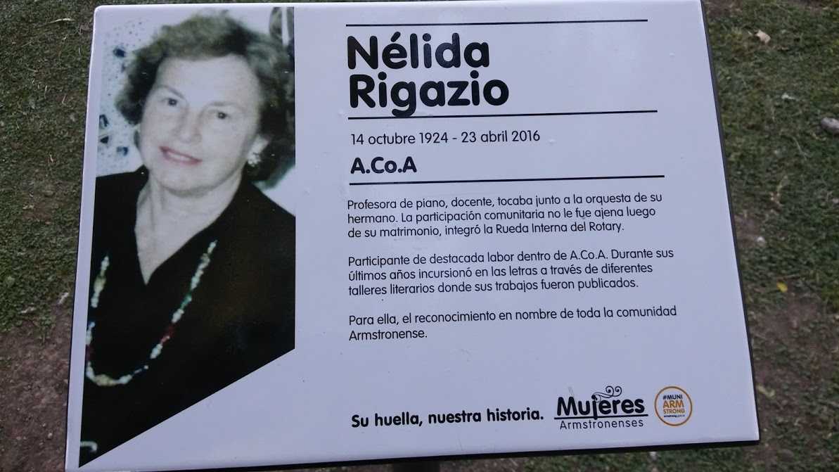 • Nélida Ana Rigazio, profesora de piano, docente, tocaba junto a la orquesta de su hermano. La participación comunitaria no le fue ajena luego de su matrimonio, integró la Rueda Interna del Rotary. Participante de destacada labor dentro de A.Co.A. Durante sus últimos años incursionó en las letras a través de diferentes talleres literarios donde sus trabajos fueron publicados.