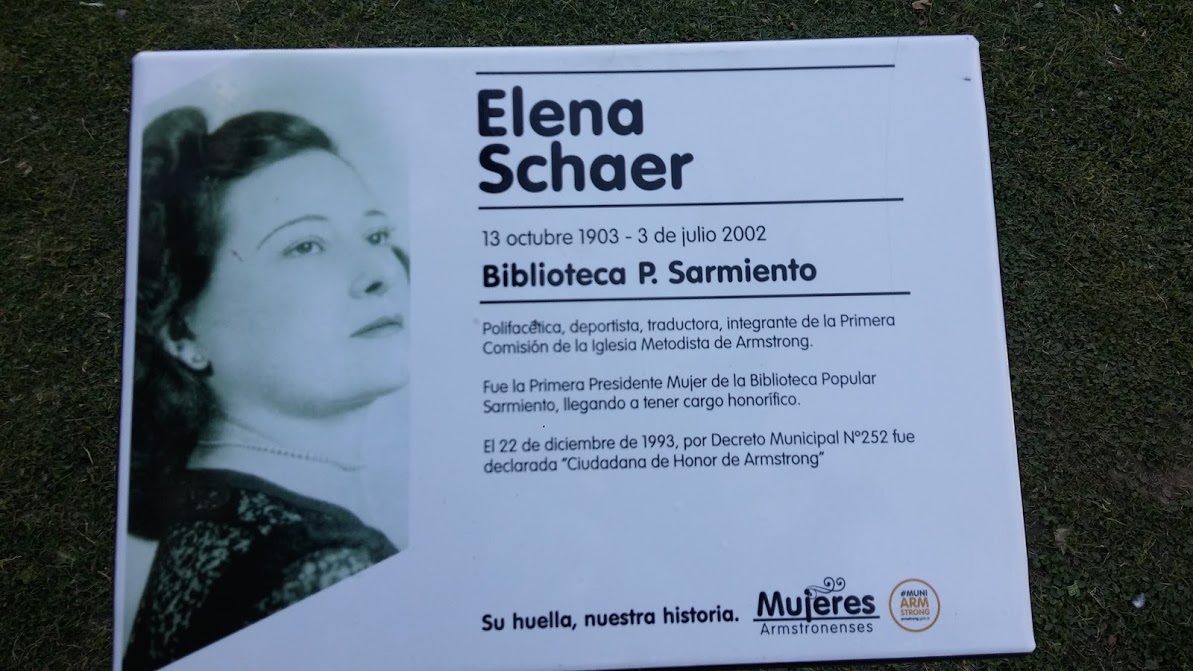 • Elena Paulina Schaer, polifacética, deportista, traductora, integrante de la Primera Comisión de la Iglesia Metodista de Armstrong. Fue la Primera Presidente Mujer de la Biblioteca Popular Sarmiento, llegando a tener cargo honorífico. El 22 de diciembre de 1993, por Decreto Municipal N° 252 fue declarada Ciudadana de Honor de Armstrong. Nominada por la Biblioteca Popular Sarmiento.