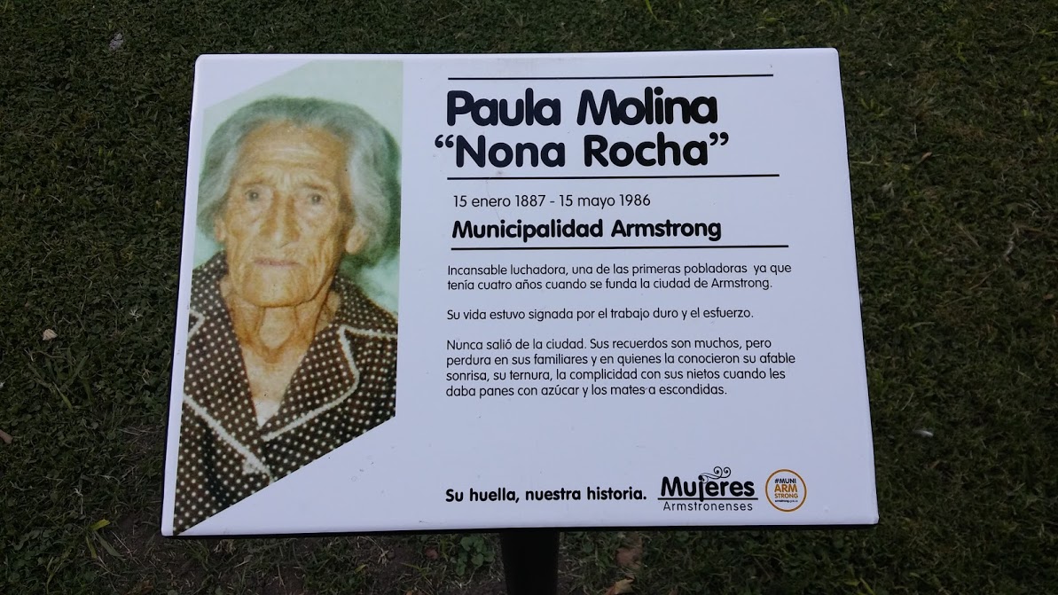 • Paula del Rosario Molina “ la Nona Rocha” incansable luchadora, una de las primeras pobladoras ya que tenía cuatro años cuando se funda la ciudad de Armstrong. Su vida estuvo signada por el trabajo duro y el esfuerzo. Nunca salió de su ciudad. Sus recuerdos son muchos, pero perdura en sus familiares y en quienes la conocieron su afable sonrisa, su ternura, la complicidad con sus nietos cuando les daba panes con azúcar y los mates a escondida.