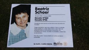 • Beatriz Susana Schaer, docente de basto recorrido en las instituciones educativas de la ciudad. Integra, bondadosa, generosa, solidaria. Todas sus virtudes fueron puesto en su labor diaria frente al aula. Dejo una profunda huella en todos quienes la conocieron, sus compañeros de trabajo, docentes y no docentes y sobre todo en sus alumnos. Designada por Escuela N° 262 Domingo Faustino Sarmiento y la Escuela N° 33 Dr Mariano Moreno.