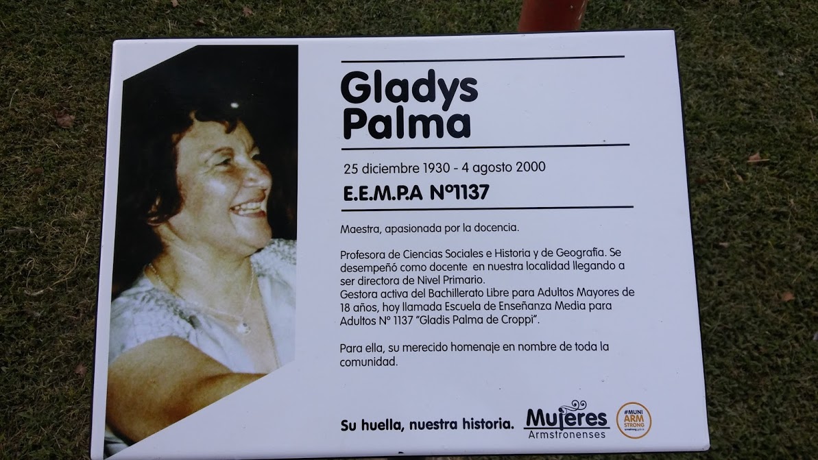 • Gladis Palma, maestra, apasionada por la docencia. Profesora de Ciencias Sociales e Historia y de Geografía. Se desempeñó como docente en nuestra localidad llegando a ser Directora de Nivel Primario. Gestora activa del Bachillerato Libre para Adultos Mayores de 18 años, hoy llamada Escuela de Enseñanza Media para Adultos N° 1137 “Gladis Palma de Croppi” , denominada así por Disposición Ministerial N° 93/12. Referenciada por EEMPA N° 1137