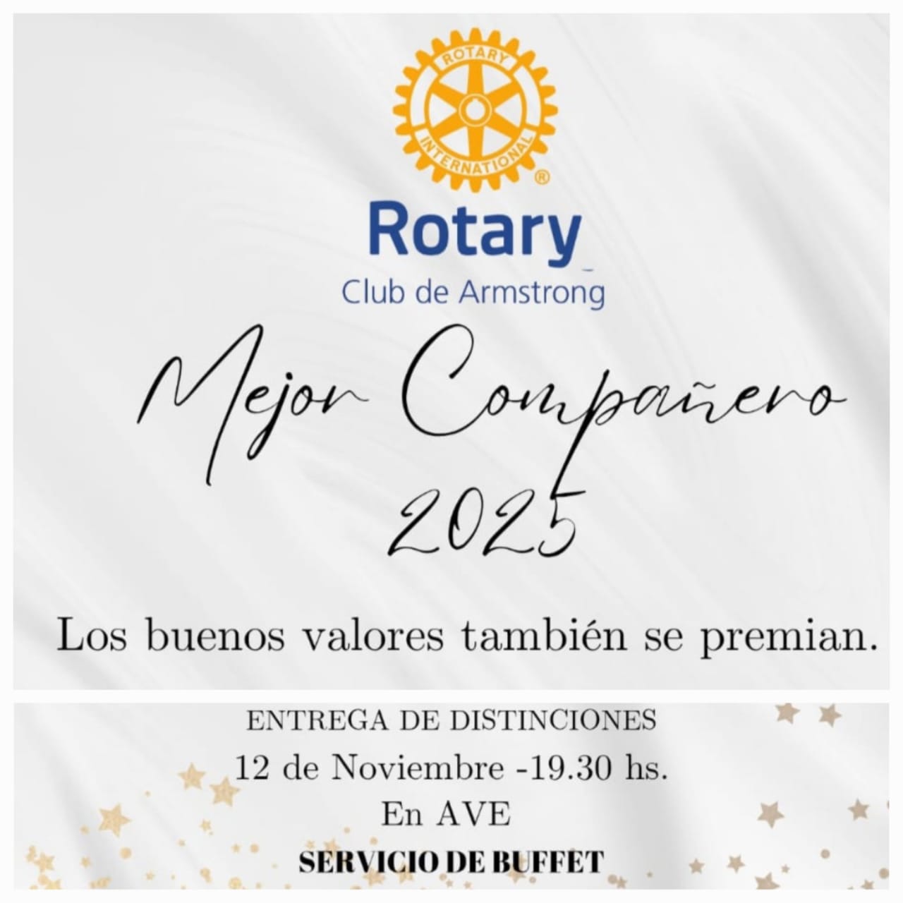 Rotary Club de Armstrong invita a participar del Acto de entrega de reconocimiento a los Mejores Compañeros 2025 de los establecimientos educativos, comercios, industrias, empresas y diferentes instituciones de nuestra ciudad, como así también, reconoceremos a los maratonistas Armstronenses mejores posicionados en la última Maratón «Delfo Cabrera y entregaremos el reconocimiento S.A.T.O. (reconocimiento del Servicio a Través de la Ocupación). Dicho acto se llevará a cabo el día 12 de noviembre a las 19.30hs en el salón de A.V.E, sito en Moreno y Delfo Cabrera. Habrá servicio de buffet a beneficio del Grupo A.V.E.