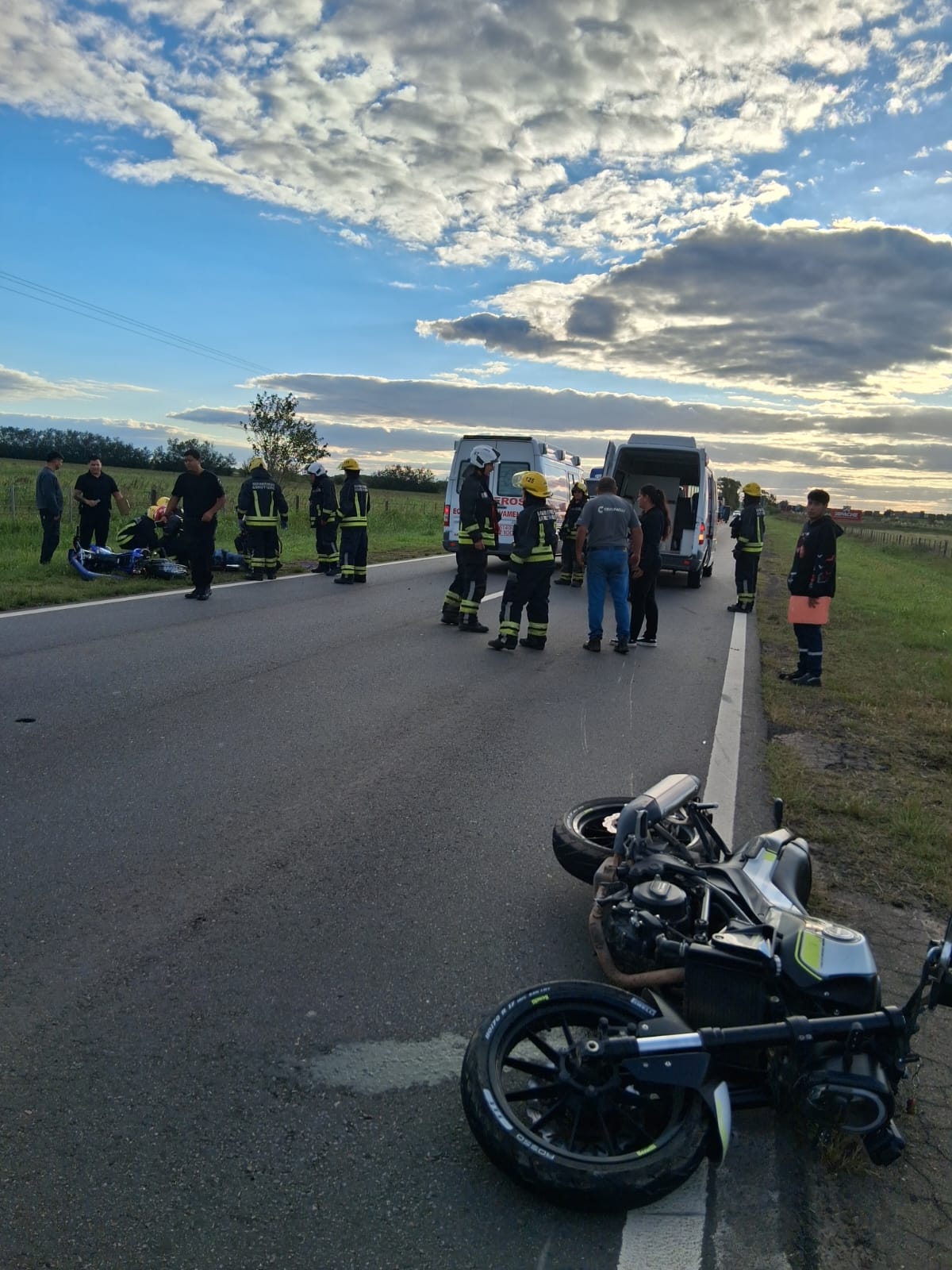 En el Día de ayer Siendo las 17:30 toque se sirena por accidente en Ruta 9 km 391. Por causas que se tratan de establecer entran en colisión 2 motos que viajaban en el mismo sentido. Se inmovilizo a los dos conductores y trasladamos al Samco de Armstrong para su atención. Trabajaron en el lugar Policía, Orden Público y Bomberos.