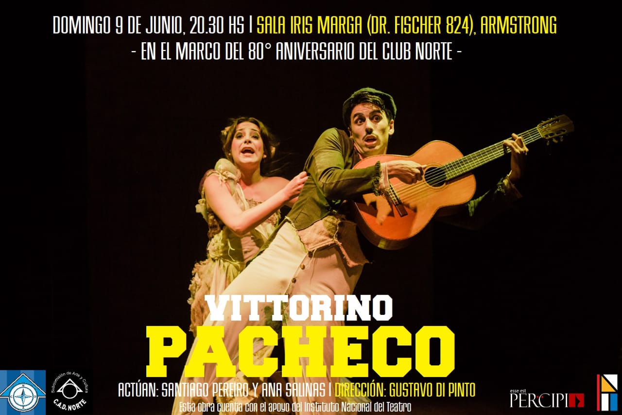Domingo 9 de junio a las 20:30 horas en la Sala «Iiris Marga» de Club Norte en la ciudad de Armstrong en calle Fischer 824 y en el marco del 80º Aniversario del Club Norte, se presentará la Obra «Vittorino Pacheco» bajo la dirección de Gustavo Di Pinto y con la actuación de Santiago Pereiro y Ana Salinas. Esta obra cuenta con el apoyo del Instituto Nacional del Teatro.