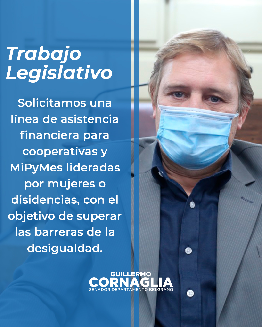 El senador provincial Guillermo Cornaglia ingresó un proyecto de Comunicación a la Legislatura solicitando al Poder Ejecutivo que extienda a todos los departamentos de la provincia el programa «Línea de Asistencia Financiera – Mujeres, Géneros y Diversidad», destinada en la actualidad solamente al departamento La Capital.