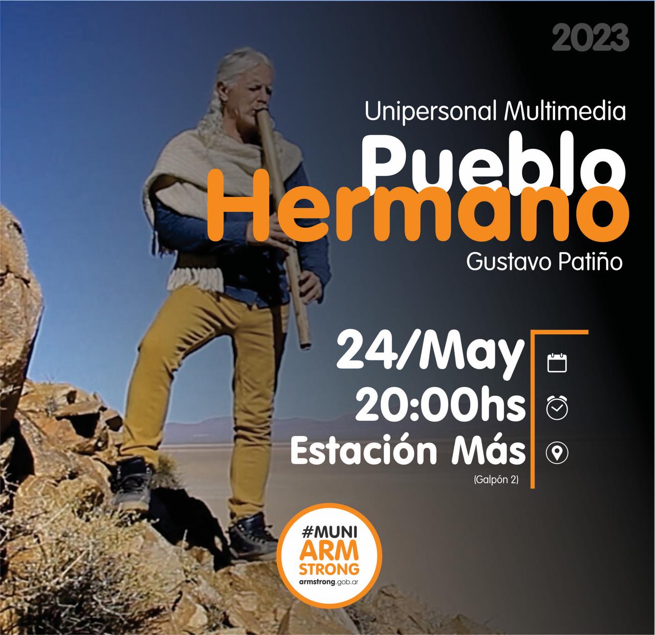 La Municipalidad de Armstrong tiene el agrado de presentar al reconocido artista Gustavo Patiño con su espectáculo unipersonal multimedia “Pueblo Hermano”, el miércoles 24 de mayo a las 20 hs. en la Estación Más, con entrada libre y gratuita.