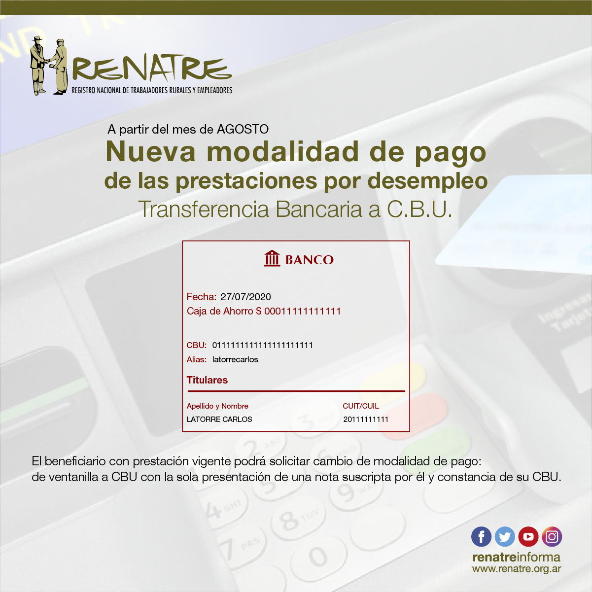 La delegación de RENATRE (Registro Nacional de Trabajadores Rurales y Empleadores) Santa Fe Sur informó que la entidad nacional incorporó a partir del mes de agosto como nueva modalidad de pago de la Prestación por Desempleo a trabajadores rurales, la opción de transferencia bancaria a CBU.