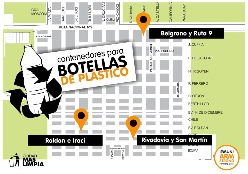 La Municipalidad de Armstrong informa que en la ciudad hay 3 contenedores disponibles para el depósito de botellas de plástico vacías, a las que luego se les da un tratamiento y una disposición final, colaborando así con el medio ambiente. Los mismos se encuentran enBelgrano y Ruta nacional Nº 9, Roldán e Iraci, Rivadavia y San Martín- Entre todos, hacemos una ciudad más limpia preservando el medio ambiente.