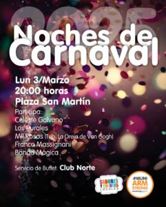 Las actividades comenzarán el domingo 2 de marzo en el parque Bracito Fuerte. Allí se presentarán Los Gangaritos, Grupo “Cumbia, Pasión y Confianza”, Grupo “El Sin Cumbiero”, Nanci Bussy, Juan Martín Albaristo, y Darío y la Nueva con su tributo a Walter Olmos. El buffet estará a cargo de Club Estudiantes del Sur.
